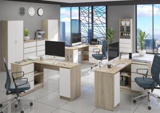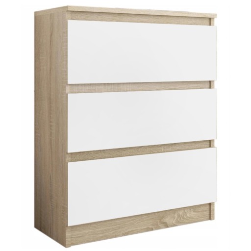 - Cała komoda w kolorze DĄB SONOMA z białymi frontami.