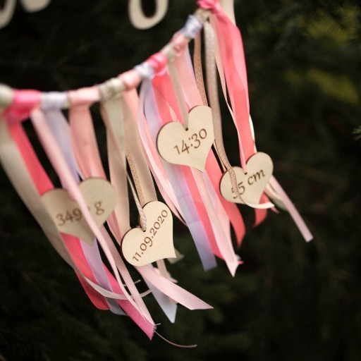 Piękny drewniany łapacz snów, z dodatkiem dekoracyjnych tasiemek i serduszek z wygrawerowaną datą, wagą, godziną oraz długością urodzonego dziecka lub wersja dla starszych dzieci z piórkami bez graweru.