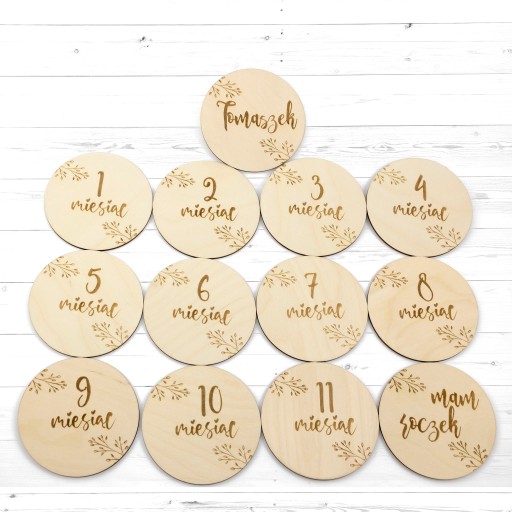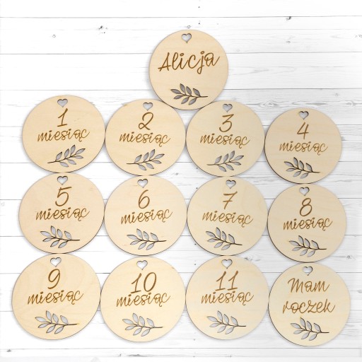 Zestaw zawiera 13 sztuk tabliczek: jedna z imieniem, a pozostałe z miesiącami życia maluszka.