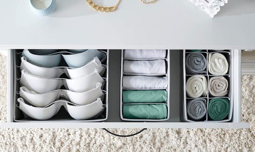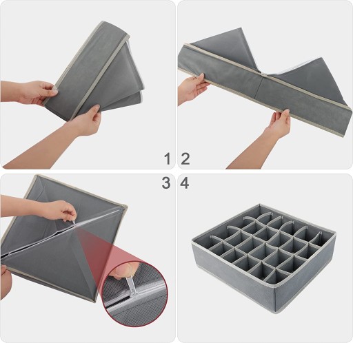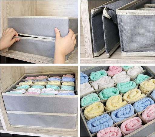 Ułatwiają nie tylko przechowanie, lecz także szybkie znalezienie w szufladzie potrzebnej rzeczy: skarpetek, bielizny, krawata lub paska. Wykonane z oddychającego materiału, dodane są również tekturki aby usztywnić pojemnik.