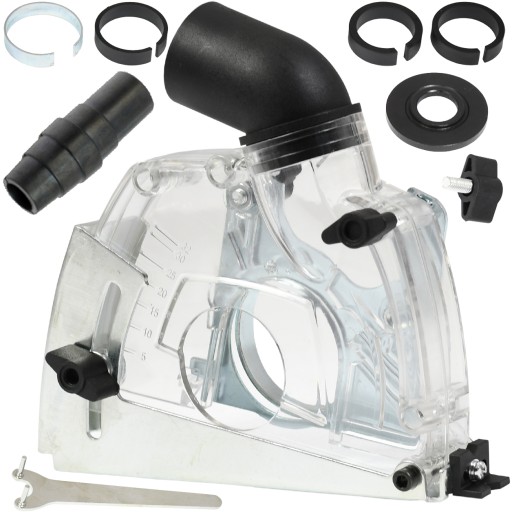 Osłona przeciwpyłowa z króćcem odsysającym do szlifierek kątowych 115 i 125mm. Osłonę mocuje się do kołnierza wrzeciona w miejsce standardowej osłony metalowej.