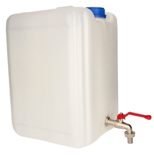 Kanister świetnie nadaje się do przechowywania i przewożenia wody i innych cieczy. Wyposażony jest w kran oraz wlew z korkiem umożliwiającym dokładne i szczelne zamknięcie.