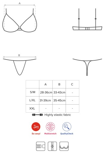 Seksownie skrojony biustonosz i figi w kolorze intensywnej czerni, tworzą wyjątkowy komplet Luvae. Mała perełka na środku biustonosza dodaje szyku, a zastosowane w miseczkach fiszbiny, dadzą komfort i wspaniałe samopoczucie w czasie noszenia. Wszystkie szczegóły tego modelu: -komplet Luvae w kolorze czarnym -koronkowy, delikatny biustonosz z fiszbinami – komfort noszenia -możliwość regulacji ramiączek i zapięcia – idealne dopasowanie -pięknie skrojone stringi w zestawie – niesamowity wygląd pośladków -przyjemny i elastyczny materiał Multistretch (90% poliamid, 10% elastan)