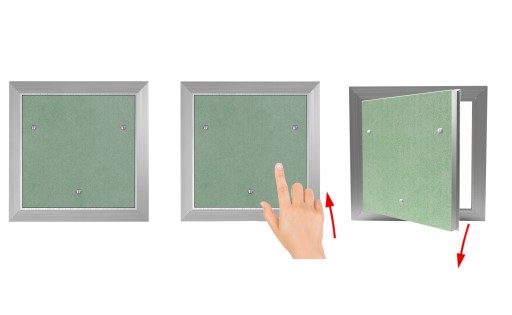W klapach zastosowano zamki sprężynowo - zatrzaskowe dzięki którym uzyskujemy powierzchnię pozbawioną rączek i uchwytów. Otwarcie klapy następuje po dociśnięciu okolic zatrzasków. Dzięki takiemu rozwiązani drzwiczki rewizyjne idealnie maskują otwór. Natomiast na wypełnienie drzwi typu karton gips można nanieść strukturę, gładź, tynk, przykleić glazurę, tapetę lub panel.