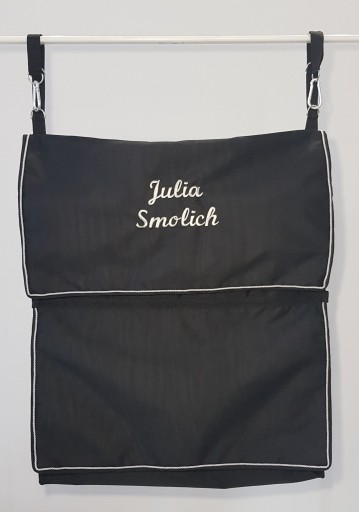 Na górnej klapie umieszczony jest haft z dowolnym napisem, np. imieniem jeźdźca, imieniem konia czy nazwą klubu.