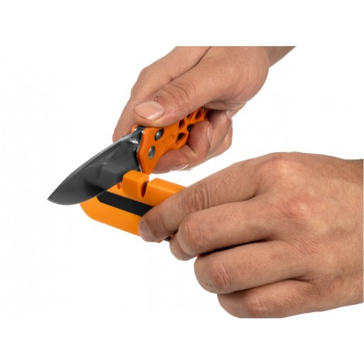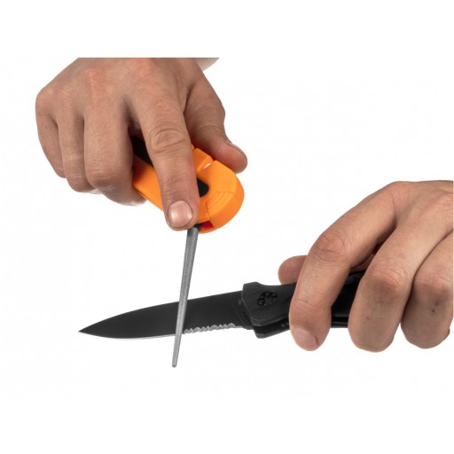 Ostrzałka ma niewielkie rozmiary, lekką polimerową konstrukcję oraz praktyczny stalowy zaczep, który pozwala na mocowanie do plecaka, kluczy lub oporządzenia.