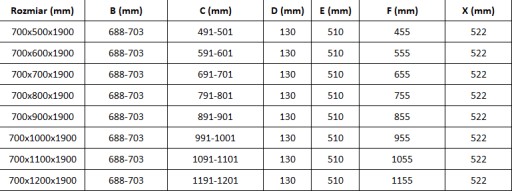 - Szerokość: 70 cm (drzwi), 80 cm (ścianka)