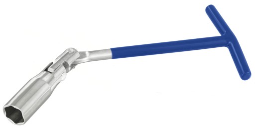 Klucz wykonany ze stali narzędziowej węglowej (CS). Polerowana nasadka, trzpień pokryty gumowym uchwytem, uniwersalny przegub pracujący w 2 płaszczyznach.