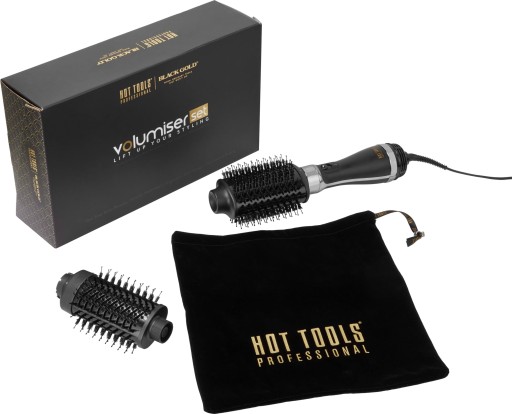 Hot Tools Professional Black Gold Volumiser to niesamowita szczotka do stylizacji, która jednocześnie układa i suszy włosy. Dzięki niemu włosy można wyprostować lub w łatwy sposób wyczarować objętość i naturalną pełnię. Nowy zestaw Hot Tools Professional Black Gold Volumiser jest dalszym rozwinięciem Black Gold Volumiser z dodatkową, wyjmowaną i mniejszą szczoteczką (o 30% mniejszą niż obecna szczotka), aby zapewnić dodatkową elastyczność. Mniejsza szczotka nadaje się szczególnie do objętości średnich i krótkich włosów oraz do mocniejszych loków.