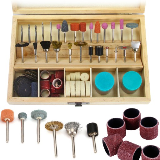 Zestaw na trzpieniu 3 mm różnego typu frezów, wierteł, tarczek, szczotek do frezowania, wiercenia i piłowania. W komplecie pasta polerska.