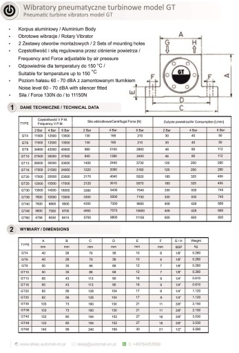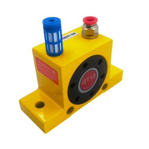 Zasada działania wibratora: wibrator typu GT jest wibratorem turbinowym. Wewnątrz osadzona jest aluminiowa turbina, w której znajdują się ołowiane ciężarki wyważające. Łopatkowa turbina wytwarza wibracje przez siłę odśrodkową dodatnich i ujemnych niezrównoważonych momentów w wirniku o wysokich częstotliwościach i małych amplitudach. Wirnik jest wsparty na dwóch nasmarowanych, dopasowanych łożyskach uszczelnionych.