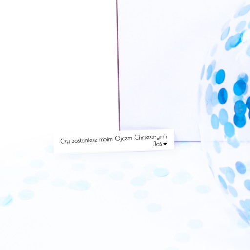 - w balonie znajduje się zwinięta karteczka z kluczowym pytaniem "Czy zostaniesz moim Ojcem Chrzestnym+ imię" lub Twoim tekstem