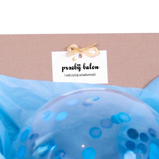 - karteczkę zamieszczoną na klapie pudełka napisem "Przebij balon i odczytaj wiadomość" z dołączoną mini agrafką