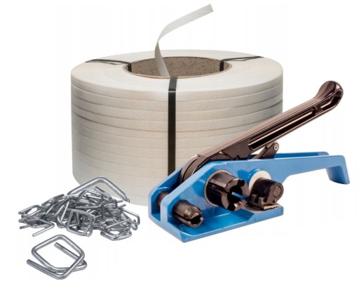 ZESTAW DO SPINANIA PALET/paczek do 500 kg. Wytrzymałość jest podana dla 5 spięć taśmą. Wytrzymałość można regulować ilością spięć. Taśma polipropylenowa jest spinana za pomocą zapinek drucianych i napinacza. Napinacz naciąga i odcina taśmę w wybranym miejscu.