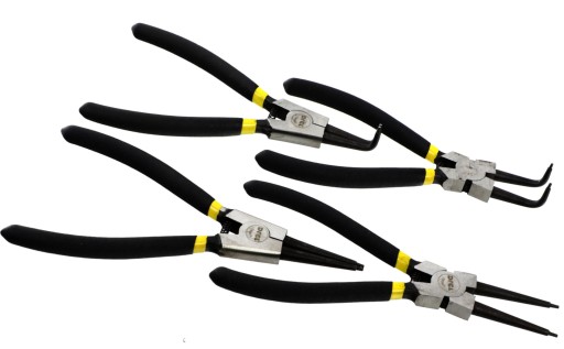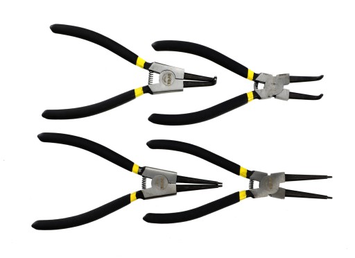 Zestaw 4 szt. szczypiec do pierścienie osadczych. Szczypce segera służą do zakładania i zdejmowania pierścieni zabezpieczających segera. Posiadają precyzyjne końcówki oraz plastikowe nakładki na rękojeściach.