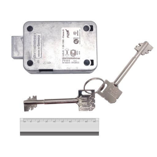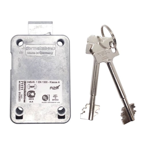 Zamek sejfowy kluczowy Kaba Mauer 71111 łączy zaawansowaną technologię z wytrzymałością. Oferuje długość klucza 90 mm i jest przeznaczony do klasyfikacji CEN 0-II zgodnie z PN-EN 1143-1 oraz ma certyfikat IMP klasy A. Zamek do sejfu posiada osiem elektronicznie ocynkowanych zapadek stalowych i około 280 000 kombinacji kluczy. Funkcja blokady klucza uniemożliwia jego wyjęcie w pozycji otwartej. Zamek atestowany został wykonany z odlewu ciśnieniowego rygla i korpusu, zapewnia odporność. Wysuw rygla wynosi 12 mm, a waga 340 g. Zamek spełnia normy ECB-S, EN 1300 A, IMP klasy A, VdS klasy, CNPP a2p (E) Niveau A, GOST klasy A, UL 473 oraz ICECON class A. Zamki do sejfów Kaba Mauer są idealne do zabezpieczania sejfów, skrytek bankowych, instytucji finansowych, biur, hoteli oraz w domach prywatnych, gdzie priorytetem jest bezpieczeństwo i prywatność.