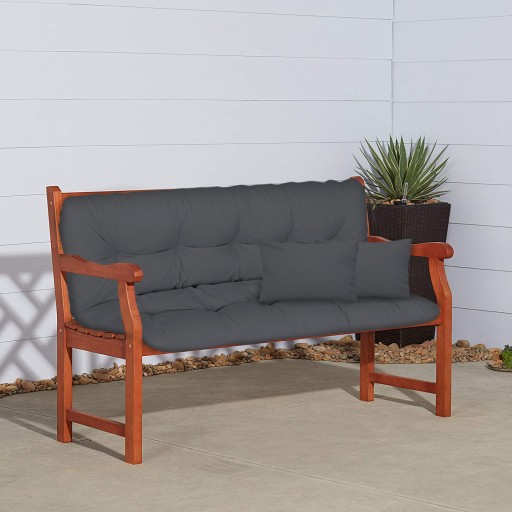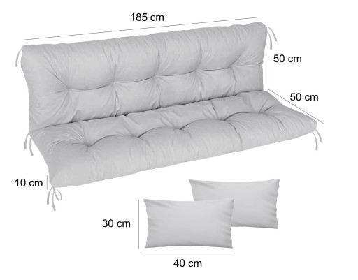 Poduszki ogrodowe składają się z 2 części, są wyposażone w sznurki w każdym rogu, które służą do mocowania. Pikowana tapicerka ma ok. 10 cm grubości, dzięki czemu jest niezwykle wygodna. Dwie dodatkowe poduszki (w rozmiarze 40 x 30) mogą służyć jako podłokietniki.