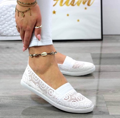 Przepiękne klasyczne koronkowe trampki w kolorze białym. Trampki wykonany w całości ze miękkiej przyjemnej w dotyku nie brudzącej się tkaniny. Gumka w trampeczkach (SLIP ON) zapewnią wygoda nakładania i noszenia. Buciki mają anty poślizgową gumową podeszwę z bieżnikiem. Dobrze trzymają stopę i dopasują się do każdej nogi.