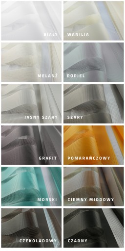 Kolor tkaniny może nieznacznie różnić się w zależności od ustawień ekranu. W przypadku tkanin półprzepuszczalnych rzeczywisty kolor może się zmienić w zależności od intensywności światła padającego na roletę.