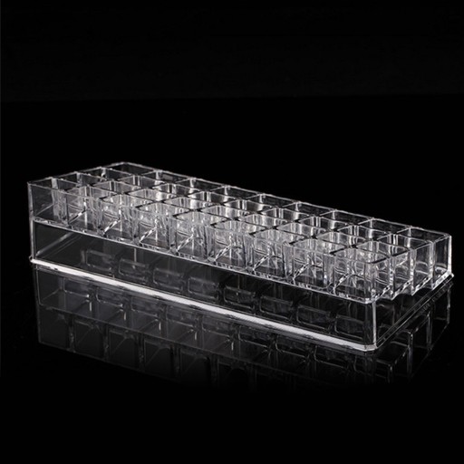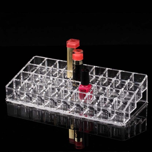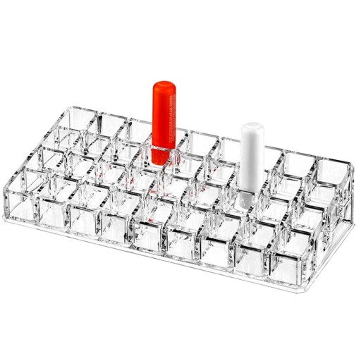 Praktyczny, wykonany z grubszego, elegancko połyskującego akrylu organizer na szminki lub lakiery do paznokci. Pozwala w sposób łatwy i praktyczny uporządkować swoją toaletkę. Łącznie posiada 36 przegródek.