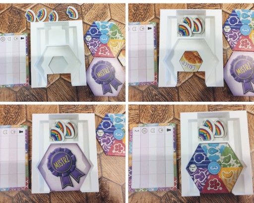Dzięki specjalnie zaprojektowanemu organizerowi, kafle kotów i dedykowane im znaczniki są teraz w jednym miejscu: Po wybraniu odpowiednich zwierzaków do gry odpowiednie żetony będą w tym samym miejscu!