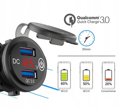 Ładowarka motocyklowa 2x QC3.0 + WOLTOMIERZ + dotykowy przycisk: