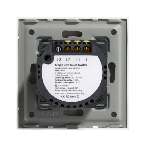 Podłączenie przewodów włącznika odbywa się jak w standardowych włącznikach. Jako L podłączamy przewód prądowy-zasilanie oraz jako L1 i L2 przewody wyjściowe na obwód (odbiornik – lampa, światło, itp.)
