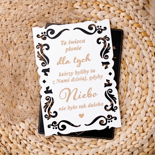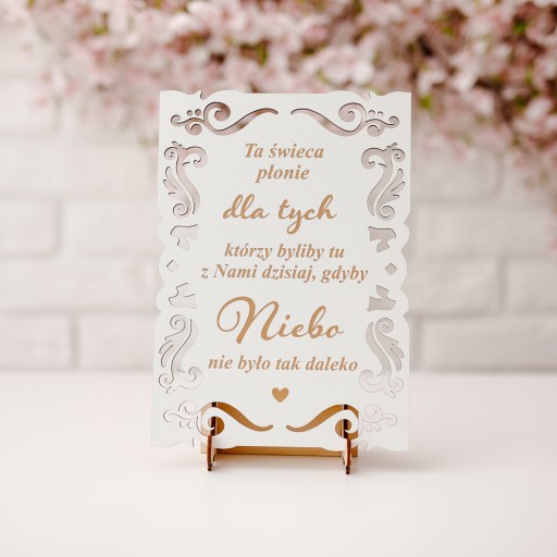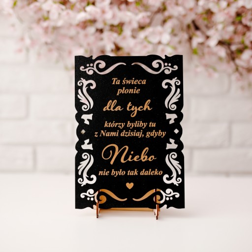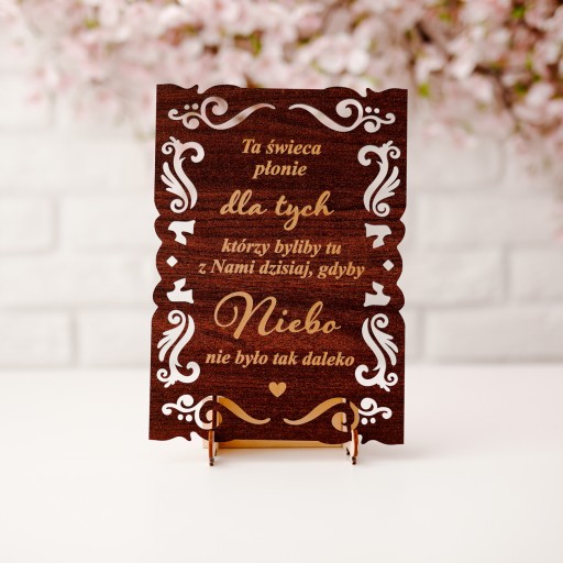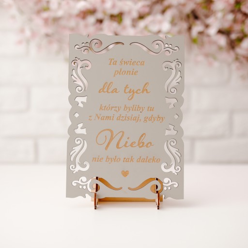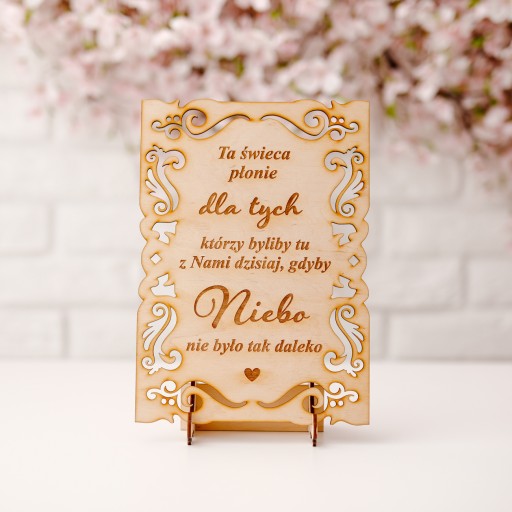 Nasza tabliczka jest świetnym dodatkiem weselnym aby uczcić pamięć naszych bliskich. Nasza tabliczka charakteryzuje się wyjątkowym tekstem ku pamięci oraz nietuzinkowym wyglądem i wykończeniem tabliczki.
