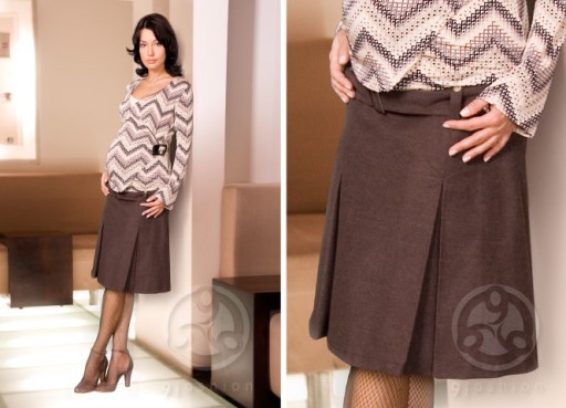 Elegancka spódnica z dwiema kontrafałdami i ozdobnym paskiem, świetnie leżąca na sylwetce, uszyta z bawełny imitującej w wyglądzie wełnę.