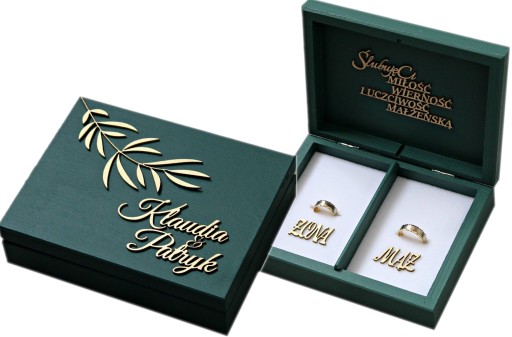 Pudełko na obrączki pomalowane ręcznie z kolorze butelkowej zieleni.