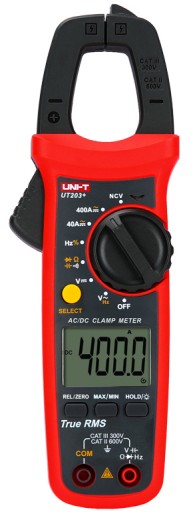 - Miernik cęgowy UT203+ umożliwia wykonanie najczęściej mierzonych parametrów elektrycznych: pomiar prądu DC/AC cęgami bez konieczności przerywania obwodu elektrycznego, oraz pozostałe parametry przewodami pomiar napięcia DC/AC, pomiar częstotliwości, pomiar ciągłości obwodu elektrycznego, pomiar oporności, pomiar pojemności kondensatorów. UT203+ mierzy wartość skuteczną napięcia True RMS i prądu zmiennego AC.