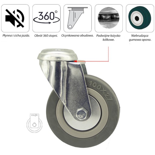 - KOŁO składa się z polipropylenowej piasty oraz z niebrudzącej gumowej opony, posiada łożysko ślizgowe. Kółka mają wytrzymałość po 80 kg na kółko. Wolno się zużywają, są odporne na uszkodzenie, amortyzują uderzenia i wibracje. Obracają się o 360 stopni ułatwiając manewrowanie meblami czy wózkiem. Gładko obracają się po twardych i gładkich powierzchniach jak beton przy bardzo małym tarciu.