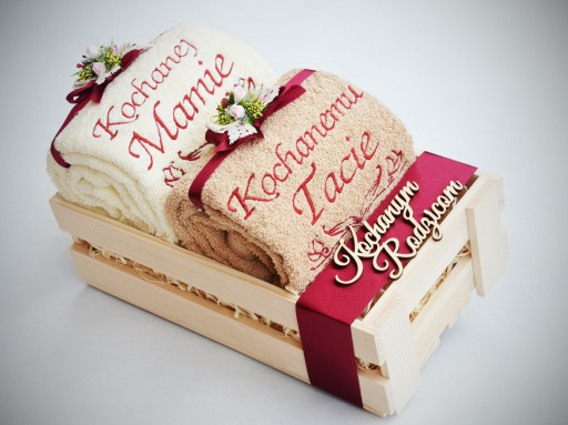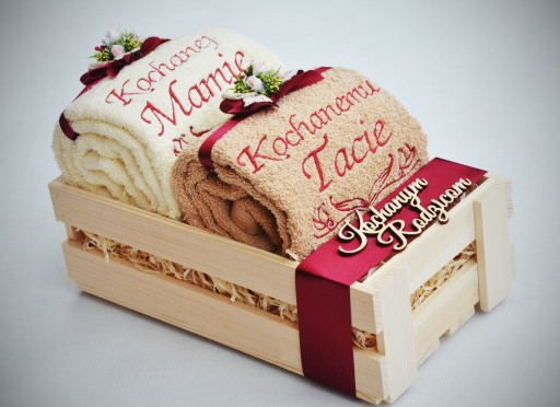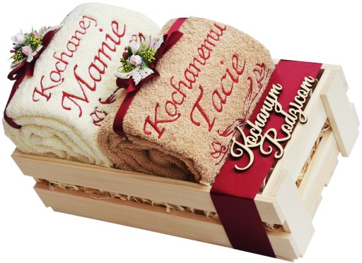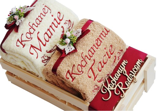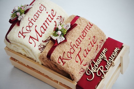 Eleganckie PODZIĘKOWANIA dla RODZICÓW na ślub - praktyczny i oryginalny komplet ręczników z haftem dla Mamy i Taty - wyjątkowy i ekskluzywny zestaw w drewnianej skrzynce.