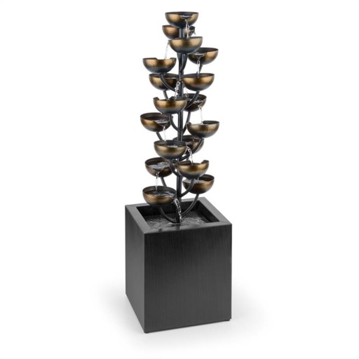 Odpoczynek przy łagodnie szemrzącej, ozdobnej fontannie Blumfeldt Joshua Tree sprawia podwójną przyjemność. Poczynając od czubka drzewka, orzeźwiająca woda przelewa się nieprzerwanie przez 17 mis, dostarczając przyjemnych doznań wizualnych i akustycznych. Fontanna Joshua Tree wykonana z metalu, jest niezwykle trwała i odporna na oddziaływanie warunków atmosferycznych. Ponadto zachwyca wykończeniem w wyjątkowo wiernej imitacji mosiądzu, która nie matowieje i doskonale komponuje się z z istniejącą aranżacją ogrodu lub wnętrza. Ciągły obieg wody gwarantuje wydajna, 7-watowa pompa. Delikatny plusk wody wywiera niezwykle uspokajający efekt, zamieniając otoczenie drzewka wodnego w oazę wypoczynku. Bardzo długi, 10-metrowy kabel, umożliwia swobodne pozycjonowanie wodotrysku Blumfeldt Joshua Tree. Wszystkie części są odporne na wpływ warunków pogodowych, dzięki czemu fontanna może śmiało pozostawać na zewnątrz, nawet przy niepogodzie.