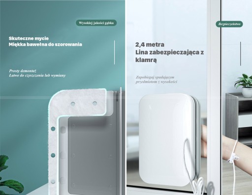 Mocna dwustronna konstrukcja magnetyczna, pozwala na czyszczenie okien, bez konieczności ryzyka stania przy otwartym oknie. Wbudowana gąbka do przechowywania wody może być używana przez długi czas, unikając wielokrotnego uzupełniania wody.