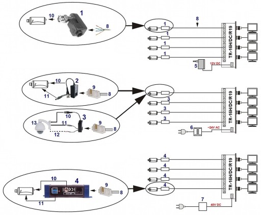 TR-16H/DC/R19 przeznaczony jest do przesyłu sygnału wizyjnego i zasilania za pomocą skrętki komputerowej (UTP, FTP). Urządzenie dopasowuje impedancję kabla koncentrycznego 75Ω do impedancji przewodu symetrycznego zapewniając przesył sygnału wizyjnego do 400m @ PAL (skrętka komputerowa 5 kategorii) oraz eliminuje zakłócenia niesymetryczne. Sygnał video wykorzystuje jedną parę skrętki, pozostałe trzy pary wykorzystane są do przesyłu napięcia zasilania.