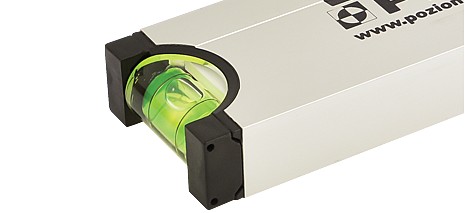 Poręczna poziomnica anodowana z libellą poziomu i pionu – ta ostatnia wbudowana w miejscu jednej z końcówek.