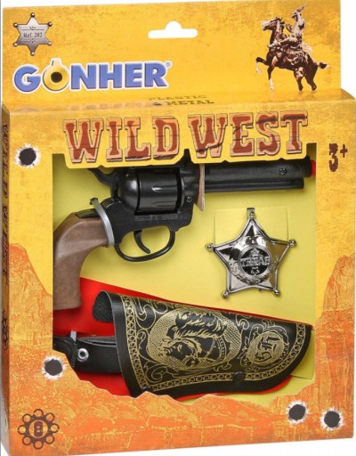Zestaw zawiera plastikowy rewolwer kowbojski na 8 naboi, kaburę oraz odznakę szeryfa.