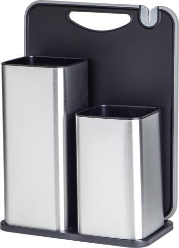 Blok posiada dwie komory - na noże i przybory kuchenne. Solidna podstawa zapewnia stabilność stojaka. Dzięki stojakowi zaoszczędzisz miejsce w kuchni, które zawsze jest na wagę złota. Wykonany z wysokiej jakości stali nierdzewnej oraz tworzywa sztucznego. Wypełnienie w postaci wyjmowanych pręcików, ułatwi czyszczenie stojaka. Wkład można myć. W tylnej części bloku znajduje się miejsce na deskę do krojenia z funkcją ostrzałki i miarki. Przy rękojeści deski znajduje się gniazdo przeznaczone do ostrzenia noży. Na powierzchni roboczej deski do krojenia znajduje się łatwo dostępna miarka do odmierzania długości cięcia produktów. W celu prawidłowego użytkowania stojaka należy przechowywać w nim tylko suche noże.