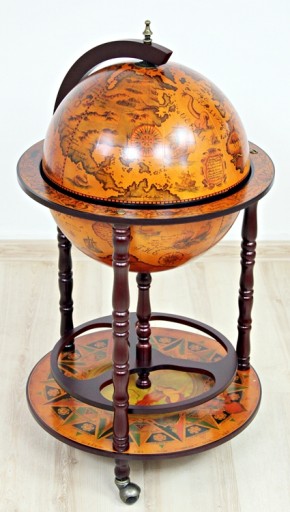 Stylowy przedmiot, który będzie idealnym pomysłem na prezent. Jest bardzo praktyczny i funkcjonalny. Wewnątrz otwieranej kuli znajduje się miejsce na butelki i kieliszki. Dolna półka posiada profilowane obejmy do butelek. Barek posiada obrotowe, łożyskowane kółka.