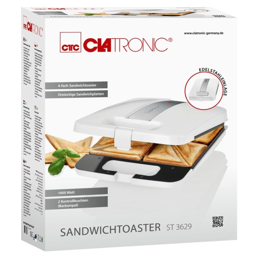 Dzięki tosterowi Clatronic ST 3629 zasmakujesz w rozgrzanych tostach z roztopionym, ciągnącym się serem w środku. Dzięki trójkątnym panelom warstwowym przyrządzimy aż 8 trójkątny tostów jednocześnie.
