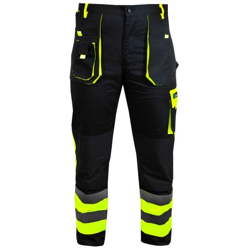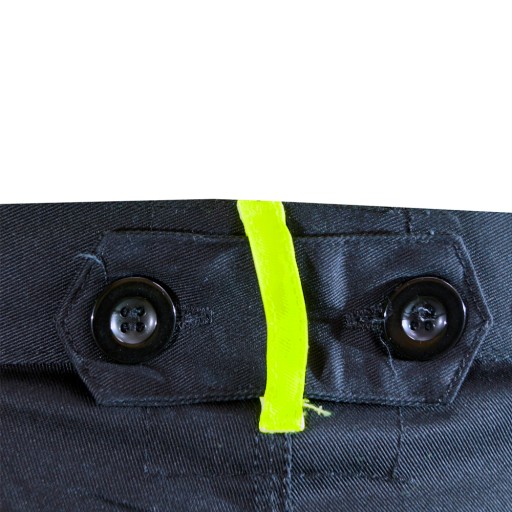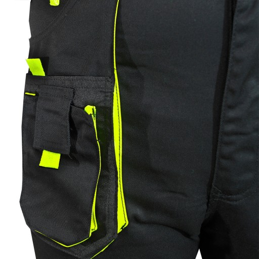Kieszenie posiadają Żółte klapy i czarne pojemniki, aby uchronić spodnie przed nadmiernym brudzeniem, przy zapewnieniu najwyższej widoczności i bezpieczeństwa.