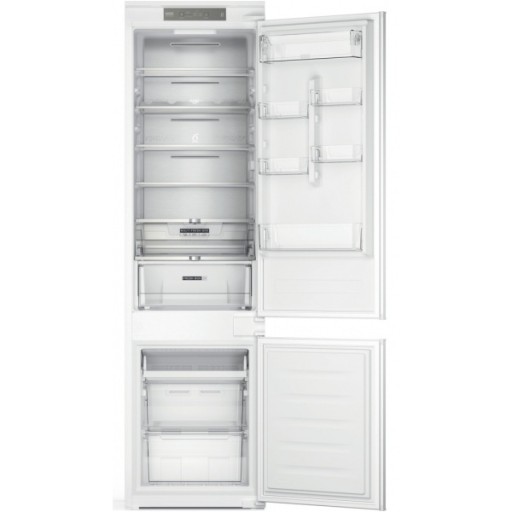 Lodówko-zamrażarka do zabudowy Whirlpool w kolorze białym. Szklane półki zapewniają wytrzymałość i elegancję. Wentylator zapewnia płynny i równomierny przepływ powietrza we wnętrzu urządzenia w celu udoskonalonej wentylacji. Czujniki 6-ty Zmysł automatycznie obniżają temperaturę w lodówce po włożeniu nowych produktów, zmniejszając zużycie energii.