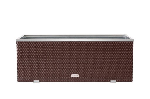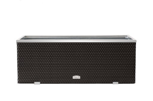 Donica wykonana z wyplatanego technorattanu. Wnętrze wykonane z blachy ocynkowanej. Listwy ozdobne wykonane z polerowanego aluminium.