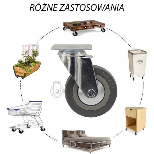 - KOŁO składa się z polipropylenowej piasty oraz z niebrudzącej gumowej opony, posiada łożysko ślizgowe. Kółka mają wytrzymałość po 80 kg na kółko. Wolno się zużywają, są odporne na uszkodzenie, amortyzują uderzenia i wibracje. Obracają się o 360 stopni ułatwiając manewrowanie meblami czy wózkiem. Gładko obracają się po twardych i gładkich powierzchniach jak beton przy bardzo małym tarciu.