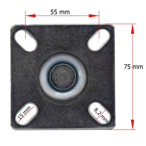 - OBUDOWY wykonane są blachy stalowej o dużej wytrzymałości. Płytka ma wymiary 75 mm x 75 mm. Kółka mają średnicę 100 mm, a centra mocowań mają wymiar 55 x 55 mm i owalne otwory do mocowania o wymiarach 15 x 8,2 mm. Wysokość całkowita wynosi 130 mm.