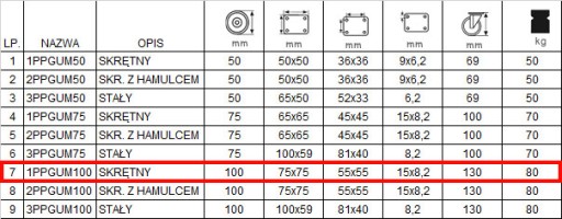 Koło składa się z polipropylenowej piasty oraz z niebrudzącej gumowej opony, posiada łożysko ślizgowe, wersja z osłonką. Mocowanie zestawu na płytkę o kodzie 1PPGUM100. W tabeli pod pozycją 7.