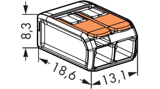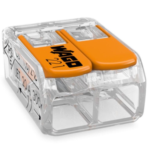 ZŁĄCZKA WAGO 221-412 SŁUŻY DO ŁĄCZENIA PRZEWODÓW TYPU DRUT LUB LINKA. DŹWIGNIE POZWALAJĄ W ŁATWY SPOSÓB WPIĄĆ PRZEWODY W ZACISKI. TRANSPARENTNA OBUDOWA POZWALA ZWERYFIKOWAĆ POPRAWNOŚĆ POŁĄCZENIA.