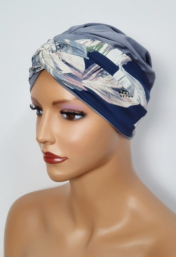 Turban gotowy do założenia , widoczna opaska przeplatka jest umarszczona i doszyta na stałe do turbanu .Zakładamy wszystko jako całość na głowę.