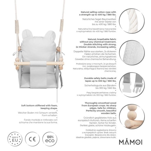 - Brak stosowania materiałów toksycznych, chemicznych czy alergenów. Skandynawska huśtawka MAMOI® jest całkowicie bezpieczna dla malucha.